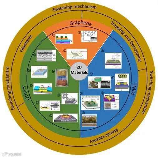 河北大学闫小兵教授课题组联合深圳大学张晗教授课题组总结了当今新型二维材料在忆阻器方面的应用,其中包括石墨烯及其衍生物、过渡金属硫族化合物(MoS2、WS2和MoTe2)和其他二维材料(BN、黑磷、钙钛矿等)。此外,还对当今基于二维材料忆阻器常见的物理开关机制进行了分类,主要分为导电细丝(Filaments)、原子空位以及电子的俘获和脱离(Trapping and de-trapping)。最后,对基于二维材料忆阻器所面临的挑战和未来可能存在的发展方向进行了讨论,这对广大的研究者在接下来的研究中有一定的启示作用。