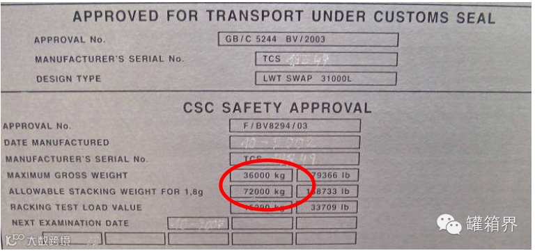 铭牌上有着非常重要的信息,提供安全操作罐箱的帮助。如上图所示,我们可以在图片中上找到最大毛重为34000kg;下图为swap罐箱的铭牌,其上显示的最大载重为36000KG.第二行显示的就是允许堆叠重量为72000kg。