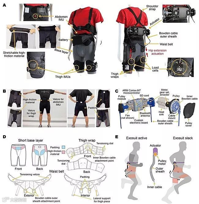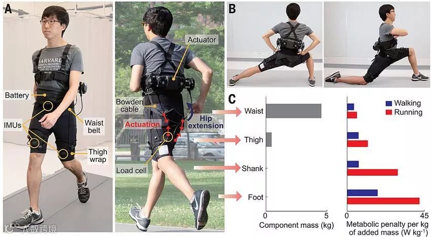 哈佛大学Conor J. Walsh和内布拉斯加大学奥马哈分校Philippe Malcolm领导的团队发明了这套被称为“exosuit”(姑且直译为“外装”)的装置,实际上是一类“可穿戴机器人(wearable robots)”。可穿戴机器人最为人所熟知的形象,莫过于漫威旗下的超级英雄——钢铁侠;而现实世界中可以帮助穿戴者增加负重和行动能力的“外骨骼(exoskeleton)”,也是可穿戴机器人的一种。相比之下,这种exosuit更加柔软和轻便,舒适度更佳。这种便携式exosuit“运动服”,不仅可以有效降低人类走路和跑步时的代谢率,提高运动效率,还很有希望用于那些患有肌肉或神经疾病的患者以及肢体残障人士,帮助他们恢复或者改善运动能力。