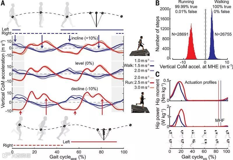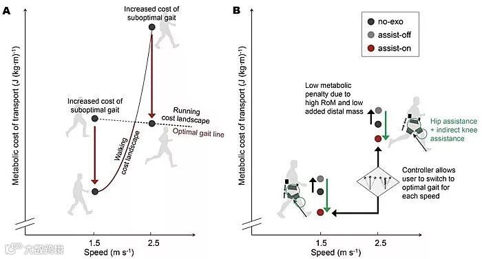 研究的出发点非常简单,人类的行走和跑步具有两种不同的步态,生物力学并不相同。低速运动时,行走的代谢成本更低;而高速运动时,跑步的代谢成本更低。因此不少开发类似可穿戴机器人的研究都把二者分开对待。有研究者曾开发出作用于髋的运动辅助装置,可以使跑步的代谢率降低8%,然而却对行走没有效果,甚至会起到干扰作用 [1]。因此本文作者希望开发出一套可兼顾二者的运动辅助装置。
