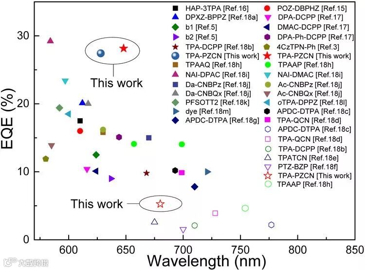 目前,蓝色和绿色TADF-OLEDs的外量子效率(EQE)已经超过30%。然而,红色TADF-OLEDs由于其发光材料窄带隙的特点导致非辐射跃迁相对强烈,从而难以达到或超过30%的外量子效率。近日,苏州大学廖良生教授课题组与樊健教授课题组合作,设计并制备了EQE接近30%的红色TADF-OLEDs。