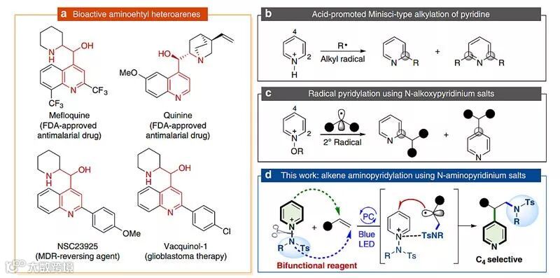 烯烃是有机化合物中最常见的结构单元,它的双官能团化是有机合成方法学中研究最广泛的课题之一。近年来,光催化方法可以用来高效的生成氮自由基,它可用与和烯烃反应形成反马氏加成的胺化产物。此外,吡啶是许多天然产物、药物、农药和精细化学品的基本结构单元(图1a)。如果能够开发一种高效方法学,利用光催化技术通过单步反应就能实现分子间烯烃氨基吡啶双官能团化,这将会具有极高的原子经济性和步骤经济性。吡啶类化合物C2位的Minisci类型烷基化已经得到了很好的证实,但往往会在C6位上过度烷基化形成单取代和双取代的混合物(图1b)。N-氨基吡啶盐中生成氮中心的自由基在光催化系统中被证明是可行的,其中吡啶通常被当作了副产物。如果将N-氨基吡啶盐作为双官能团试剂,能否将氨基自由基和吡啶同时引入烯烃(图1d)?在此过程中,吡啶盐上有两个竞争位点(C2和C4),如何解决区域选择性将可能是另外一个困难。