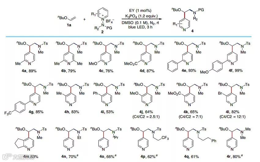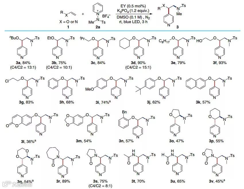 基于对机理的理解,作者对底物的范围进行了研究。如图4所示,首先针对不同的烯烃进行考察。不同的富电子烯烃,如烯基醚和烯基胺均能以优异的C4区域选择性得到β-氨基吡啶衍生物。不同链长的脂肪族乙烯基醚(3a-3e)和具有极性官能团的底物(3f和3g,羟基和氯),均以良好的收率得到目标产物。除了脂肪族乙烯基醚和端烯基醚,芳基乙烯基醚(3h-3n)和内部烯烃醚类(3o-3q)也能适用于该反应。值得注意的是,该反应还可以扩展到乙烯基酰胺类化合物,例如酰胺和氨基甲酸酯类均能产生相应的产物(3r-3v)。1a和2a在2.0 mmol的规模能以83%的收率得到目标产物3a证明该方法的实用性。