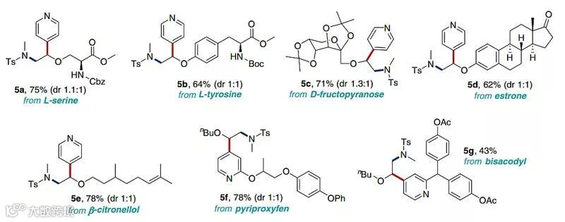 为了证明该方法具有更加广泛的合成用途,对其在复杂的生物分子后期修饰上进行了评估(图6)。在标准反应条件下,氨基酸衍生物L-丝氨酸和L-酪氨酸、D-果糖、雌激素酮、β-香茅醇、蚊蝇醚(pyriproxyfen)和比沙可啶(bisacodyl)的衍生物均能以中等收率得到相应的产物。因此,这些结果突出了该方法在复杂分子中对酯、酮、酰胺、缩醛、醚、吡啶等官能团的高耐受性。