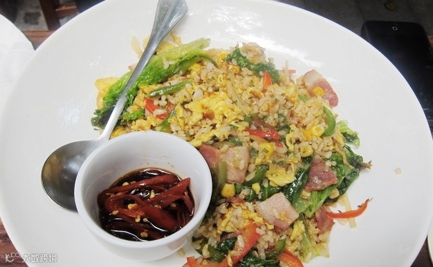 去酒吧不喝酒,而是闷头吃饭,可见对这碗饭是真爱呀。酒吧重在氛围,花园洋房式的环境非常小资,外边的露天院子有不少老外喝酒聊天,会给人仿佛在异国的错觉。室内有温暖的壁炉,冬天这个时候朋友小聚很温馨。其他的食物都一般,唯独棉花炒饭是例外。带点辣的炒饭,和泰式炒饭,有点想象里面加了培根,带着淡淡的烟熏肉香气,旁边有配辣椒酱油,可以根据喜好自己加。饭炒的很香,粒粒分名,不用加辣油其实味道就刚好了,微微的辣配上一杯清爽的啤酒,真是过瘾。