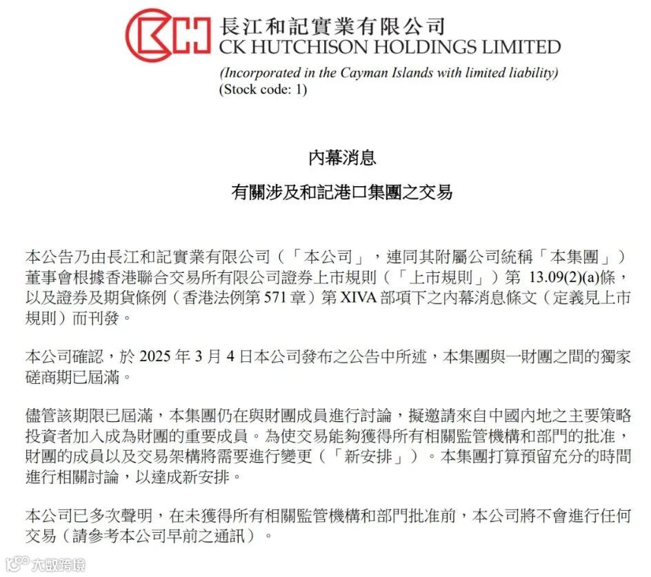 7 月 28 日清晨,长和发布公告称,其在 2025 年 3 月 4 日公告中提及的与某财团之间的独家商期已宣告结束。不过,即便该期限已过,集团依旧在和财团成员展开磋商,计划邀请来自中国内地的主要战略投资者加入,成为财团里的重要一员。