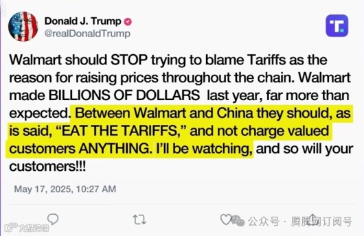 当地时间 5 月 17 日,特朗普在社交平台上批评沃尔玛,称其有能力吸收关税成本,不应将价格上涨归咎于关税。他强调,沃尔玛去年盈利数十亿美元,应 “自己吞下关税”,而非让消费者承担成本,并表示会持续关注此事