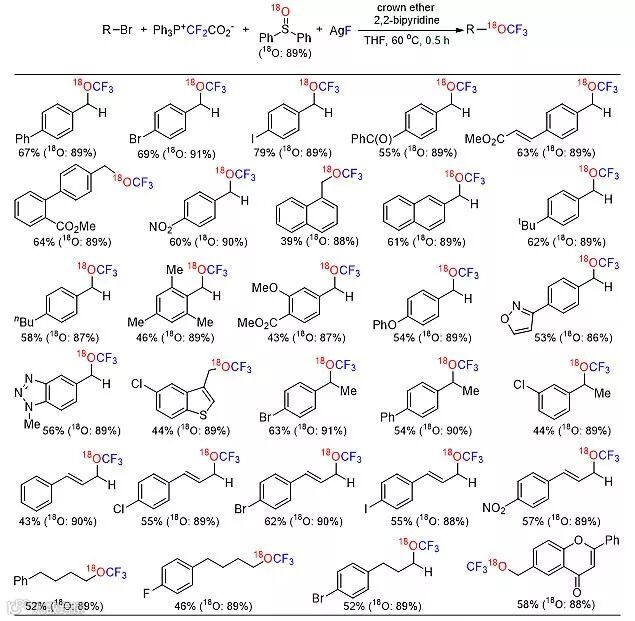 该反应是一种合成三氟甲氧基分子的较好方法,同时还可应用于18O-标记的三氟甲氧基化反应。18O-标记在蛋白质组学和有机合成等领域有重要应用。虽然已有不少三氟甲氧基化方法,但都难以用于18O-标记。他们以Ph2S=18O(18O含量:89%)为试剂,可高标记率地得到产物。另外,由于CF3O基团是通过外加氟离子而形成、且该三氟甲氧基化反应非常迅速,因此,该策略可望用于18F-标记的PET诊断试剂研发。