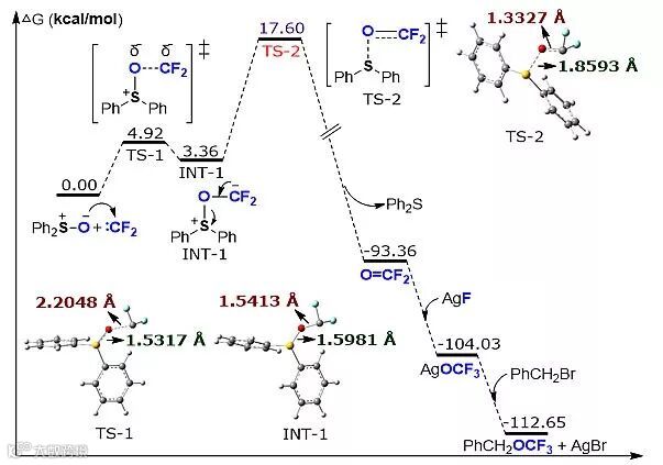 中国科学院上海有机化学研究所的肖吉昌研究员课题组曾经发现,二氟卡宾能和硫、硒等单质反应,分别生成硫代氟光气(CF2=S)[3-5]和硒代氟光气(CF2=Se)[6]。氧、硫和硒是同族元素,于是他们推测,二氟卡宾也应该能被氧化为氟光气(CF2=O)。然而,这一氧化过程不仅很难发生、而且不易直接证明,因为氟光气活性较高,难以在有机反应过程中进行检测。氟光气具有亲电性,可以和氟负离子反应产生三氟甲氧基负离子,他们通过二氟卡宾实现的三氟甲氧基化反应验证了二氟卡宾氧化这一反应过程。与硫/硒元素不同,采用氧元素的单质(氧气和臭氧)都没有观察到二氟卡宾氧化产物的生成。通过大量条件筛选发现,二苯基亚砜(Ph2S=O)能够有效氧化二氟卡宾得到氟光气(:CF2+Ph2S=O→CF2=O)。这一反应过程由“Ph2S=O/Ph3P+CF2CO2-/AgF”体系实现的卤代物三氟甲氧基化、反应活泼中间体监测以及DFT计算而得以证明。
