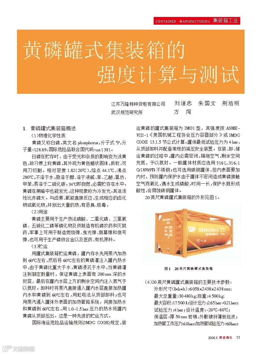 用罐式集装箱贮运黄磷,罐内存水先用蒸汽加热到60摄氏度左右,然后将60摄氏度左右的黄磷灌注入罐内热水中,由于黄磷比重大于水,黄磷浸沉于水中,当黄磷灌注到额定数量时,保证黄磷上表面有200mm 深的水封层,最后在罐内水层上方的剩余空间内注入氮气予以氮封。卸料时将蒸汽直接通入罐内水层直接加热罐内水和黄磷到60摄氏度左右,用虹吸法从顶部卸料;也可用蒸汽通入罐体外表面的加热管路系统,间接加热水和黄磷到60摄氏度左右,用1.0-1.5BAR压力的热水将罐内黄磷从顶部压出。这是一种先进的贮运方式。