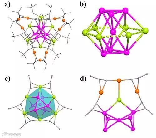 金纳米团簇具有确定的组成与结构,是理解结构与功能关系的理想体系。其中,具有发光性质的金纳米团簇近年来受到了广泛的关注,特别是谷胱甘肽配体保护的Au22(SG)18因性能优越而备受关注。人们对Au22(SG)18开展了广泛的研究并将其应用在许多领域,然而其分子结构却一直是一个迷。最近,清华大学的王泉明教授团队与湘潭大学的裴勇教授团队合作,采用MeOH/NaOH的还原体系,成功获得了叔丁基乙炔配体保护的金纳米团簇Au22(tBuCC)18,并利用X射线单晶衍射的方法测定了其结构。该结构从侧面支持了裴勇教授等人对Au22(SG)18结构预测的准确性。变温发射光谱研究发现Au22(tBuCC)18表现出有趣的热致发光变色的行为,该行为与热激活延迟荧光 (TADF) 的产生有密切的关系。