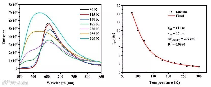 在对Au22(tBuCC)18粉末进行变温发射光谱测试时,发现该化合物随着温度从低温升高到常温(80-290K)时,发光能量有明显的蓝移,而且出现了温度越高,发光强度增强的反常的现象。结合发光寿命的研究以及对有氧无氧条件下发光行为的比较,认为该热致发光变色是由于热激活延迟荧光的产生造成的。也就是说,低温下的低能量磷光随温度升高发生热激活,产生高能量的延迟荧光。变温发光寿命的拟合结果表明S1和T1态的能量差别很小(0.037eV),支持TADF的机理。这种热致发光变色行为还是第一次在金纳米团簇体系中观察到。该工作表明金属纳米团簇还有许多未知的可能等待人们去发现。