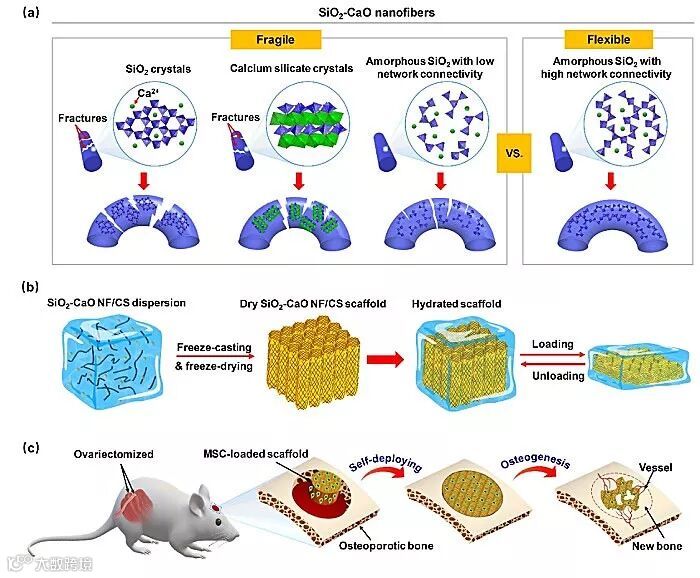 针对上述研究现状,研究团队通过调控SiO2-CaO分子构象和结晶状态,制备了兼具良好柔韧性和生物活性的SiO2-CaO玻璃纳米纤维;进一步将柔性SiO2-CaO纳米纤维同壳聚糖溶液经过均质分散-冷冻干燥后制备出具有自展开性能的SiO2-CaO纳米纤维/壳聚糖(SiO2-CaO NF/CS)三维支架,用于骨质疏松大鼠颅骨缺损的修复(图1)。