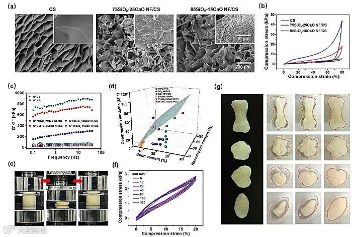图2. SiO2-CaO NF/CS支架的形貌结构及力学性能