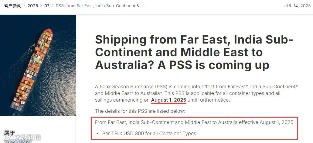 7月14日,赫伯罗特发布公告,从远东 、印度次大陆和中东到澳大利亚的旺季附加费(PSS)即将生效。本PSS适用于所有集装箱类型,2025年8月1日开始直至另行通知。每TEU:所有集装箱类型300美元。