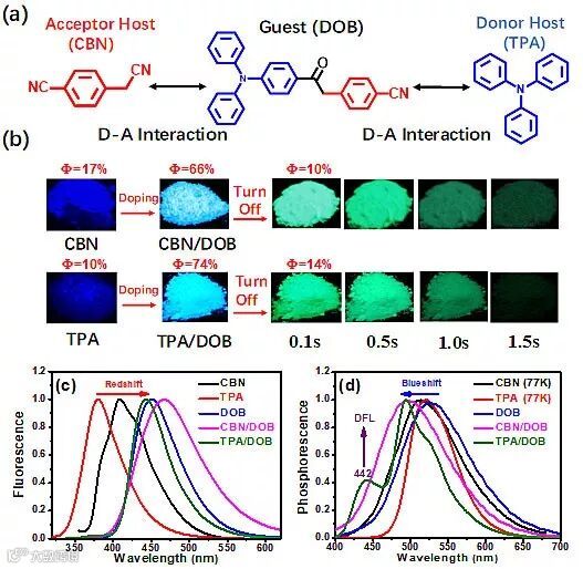 图1.(a)客体和主体化合物的分子结构。(b)撤掉激发光源前后CBN、TPA、CBN/DOB和TPA/DOB的发光图片。(c)CBN、TPA、DOB粉末及其掺杂材料在室温下的荧光光谱。(d) CBN、TPA、DOB粉末及其掺杂材料在室温下的磷光光谱。(图片来自于ACS)