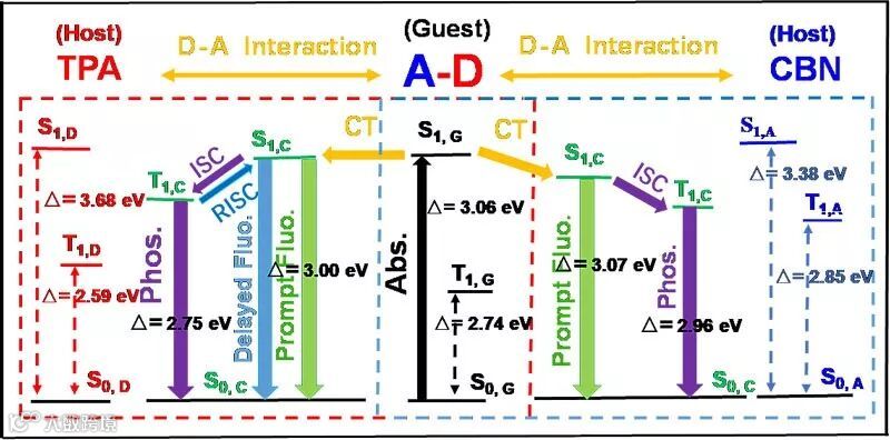 图2:TPA/DOB和CBN/DOB掺杂材料的Jablonski图。S1, D和T1, D表示TPA的单重态和三重态,S1, A和T1, A表示CBN的单重态和三重态,S1, G和T1, G表示客体分子(DOB ),S1, C和T1, C表示主体分子和客体分子之间形成的电荷转移状态的单重态和三重态。(图片来自于ACS)