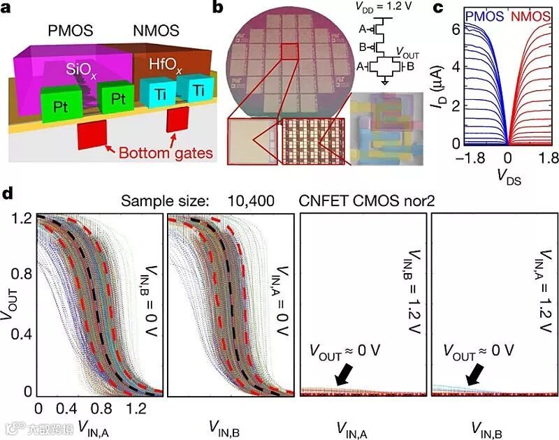 原因主要有三:(1)材料缺陷。虽然半导体型碳纳米管可以制备FET沟道,但合成过程中经常产生一定比例的金属型碳纳米管,几乎没有带隙,这将导致高泄漏电流和潜在的错误逻辑。(2)制造缺陷。在晶圆制造过程中,碳纳米管易于聚集,这些聚集体会降低CNFET电路的成品率。(3)可变性。互补电路需要制备互补的CNFET(p型和n型),而以前报道的技术缺乏可调谐性、空气稳定性和重复性。