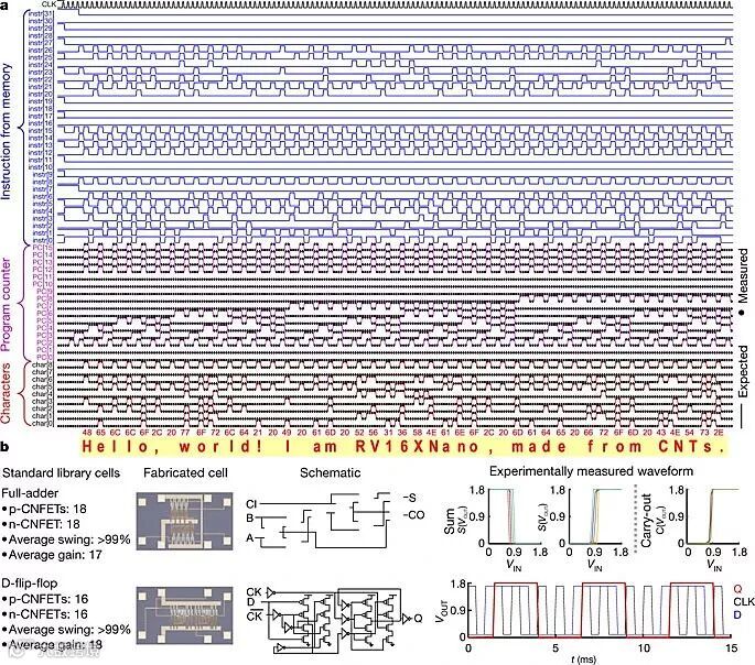 无论如何,这项工作还是在实验上证实了一条通向实用化的超越硅电子系统的道路。研究者利用RV16X-NANO芯片,执行了C语言圣经“The C Programming Language”一书中著名的程序“Hello, World”,在屏幕上打出了“Hello, World! I am RV16XNano, made from CNTs”这一段具有历史意义的话。