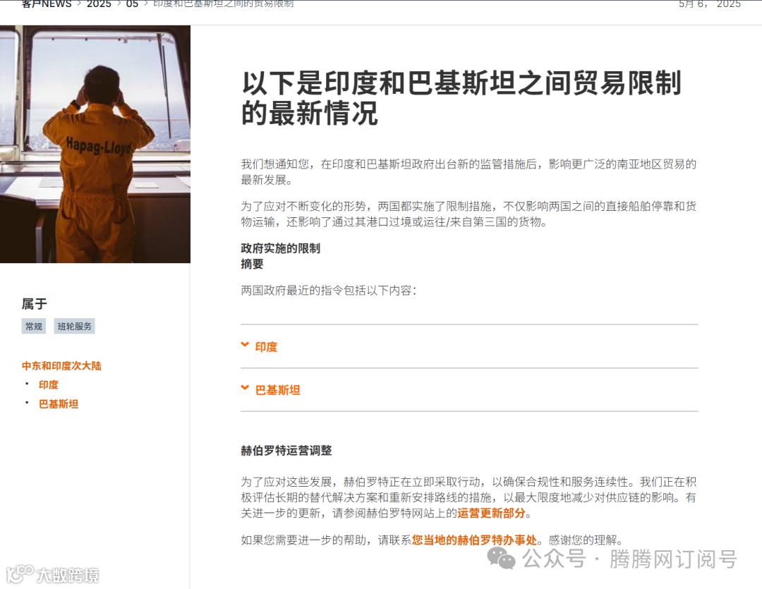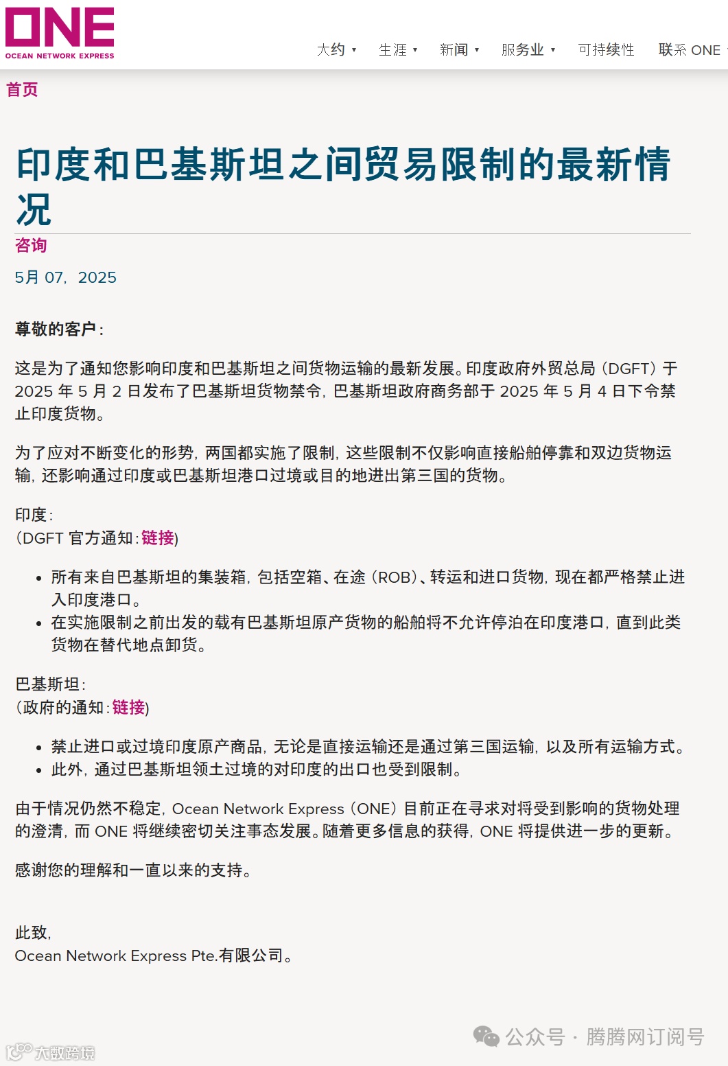 海洋网联船务(ONE)发布公告,向客户通报印度和巴基斯坦货物运输的最新进展,并表示正在寻求受影响货物的处理方案,将持续关注事态发展。