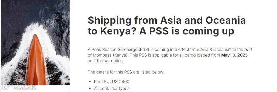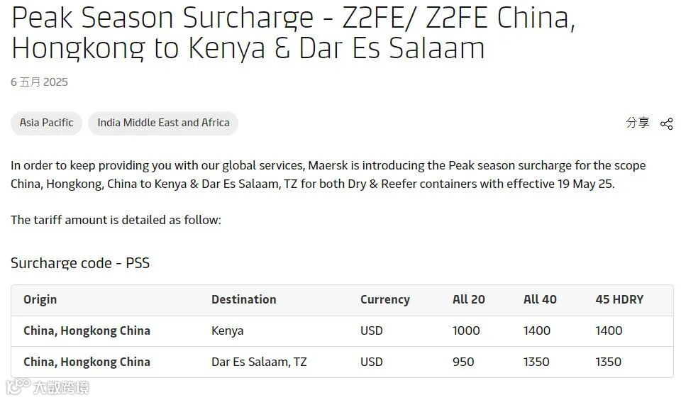 同样于 5 月 6 日,马士基发布公告,计划从 5 月 19 日起,对中国、中国香港至肯尼亚和达累斯萨拉姆的干集装箱、冷藏集装箱货物,征收旺季附加费(PSS),但暂未公布具体收费标准。