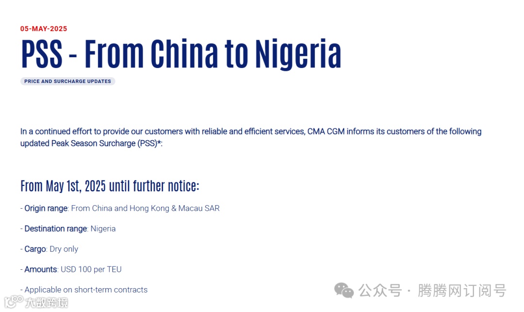 5 月 5 日,达飞发布公告,自 2025 年 5 月 1 日起,对从中国发往尼日利亚的干集装箱货物征收旺季附加费(PSS),收费标准为 100 美元 / TEU,该费用适用于短期合同,有效期至另行通知。