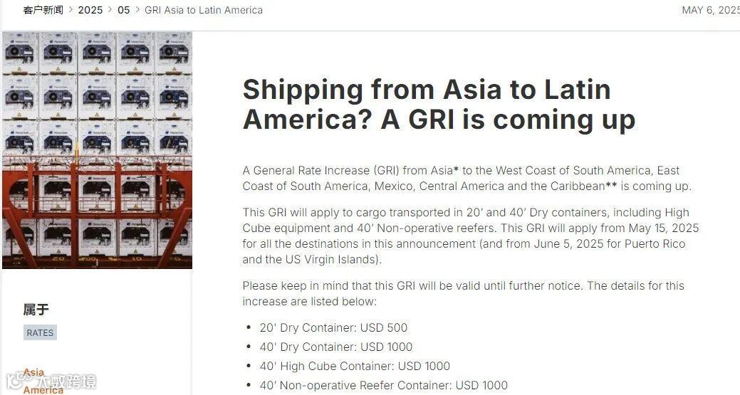 5 月 6 日,赫伯罗特发布公告,宣布将上调从亚洲至南美西、南美东、墨西哥、中美洲和加勒比海的综合费率(GRI)。