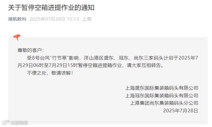 受8号台风“竹节草”影响,洋山港区盛东、冠东、尚东三家码头计划于2025年7月29日06时至7月29日15时暂停空箱进提箱作业,请大家互相转告。