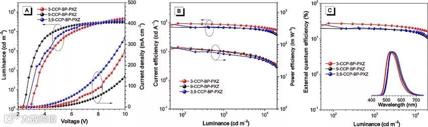 图3. 基于氯代AIDF分子的掺杂OLED器件性能曲线