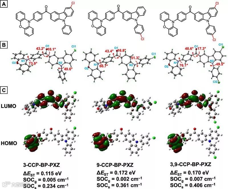 纯有机延迟荧光材料能够通过反向系间窜越(RISC)过程来有效利用三线态激子,有利于提高OLED器件的激子利用率,引起了相关研究领域的强烈兴趣。对这类材料而言,加快RISC过程有利于抑制高电压下高浓度三线态激子的湮灭,对于提高器件的效率和稳定性有重要意义。根据费米黄金法则,加快系间窜越过程的有效方法可以通过提高旋轨耦合(SOC)常数或者减小单线态和三线态能级差(ΔEST)来实现。通常情况下,引入卤素等重原子能够有效地提高分子的旋轨耦合常数,但是卤素的存在也往往导致分子固态发光效率减弱。如何通过分子设计获得同时具有高固态荧光量子产率、快速RISC过程的延迟荧光材料具有很大的挑战性。