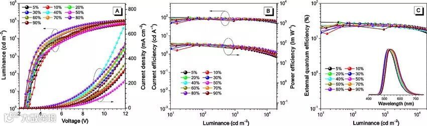 近日,华南理工大学唐本忠院士、赵祖金教授团队通过在聚集诱导延迟荧光(AIDF)分子中引入氯原子,大大加快了分子的RISC过程,成功获得了一系列具有高固态荧光量子产率、短延迟荧光寿命的发光分子。通过对比研究发现,随着氯原子的引入,分子聚集态下荧光量子产率有所提高(70.4−73.0%),SOC作用有了显著的提升(图1),并且实验测试的ΔEST也明显减小(0.016−0.019 eV),这不仅使延迟荧光寿命变短(0.42−0.76 μs),而且使延迟荧光对温度的依赖性显著降低。利用这类分子制备的非掺杂OLED器件的最大电流效率、功率效率和外量子效率分别达到了76.6 cd A-1、75.2 lm W-1和21.7%,并且效率滚降很低(图2),与没有氯取代的分子相比,电致发光性能提高明显。值得注意的是这类分子还可以在大范围掺杂比例(5−90 wt%)下用于制备掺杂OLED器件,器件性能稳定,对掺杂浓度不敏感,最大电流效率、功率效率和外量子效率分别达到了100.1 cd A-1、104.8 lm W-1和 29.1%(图3)。这些研究结果表明氯代AIDF分子不仅电致发光性能优异,而且对于器件制备工艺的高度容忍性,在实际应用中具有巨大潜力。