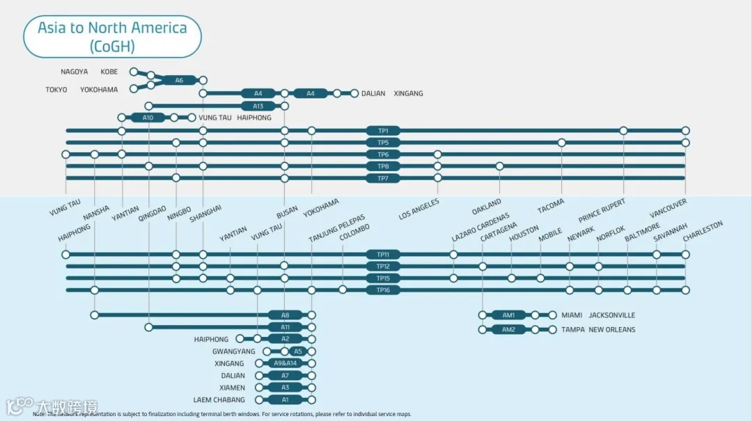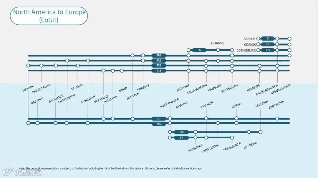 “双子星”合作的好望角服务网络,涵盖了东西向主要贸易航线,包括:亚洲-欧洲7条、亚洲-北美9条、亚洲-中东1条、欧洲-中东/印度6条、欧洲-北美6条。