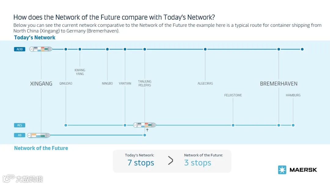 以一票从中国天津新港到德国不莱梅港的货物运输为例,靠泊港将从7个减少为3个。按照“双子星”合作网络,货物自天津新港通过穿梭快线A9航线,直航运输到丹戎帕拉帕斯,再转运至AE5航线的船舶上,之后挂靠费利克斯托后到达不莱梅港。