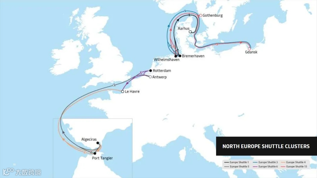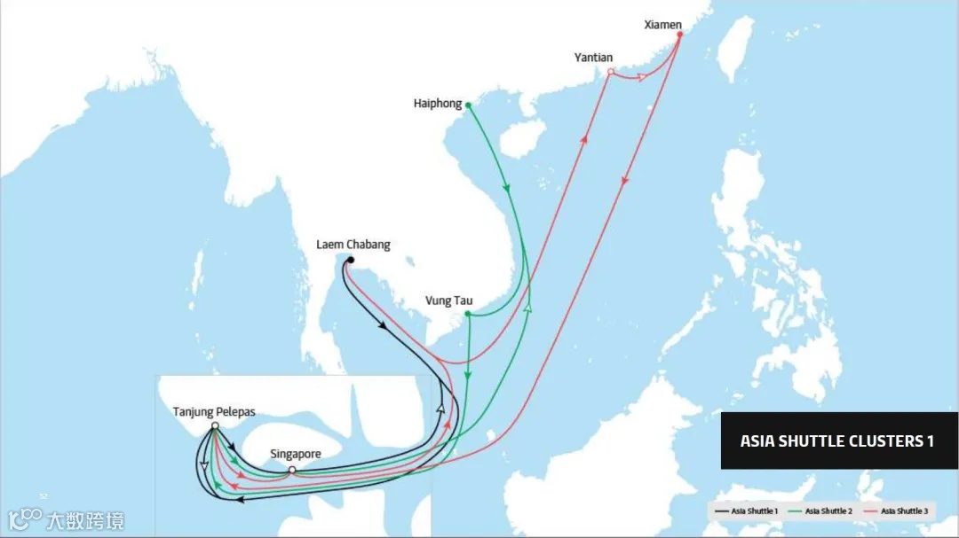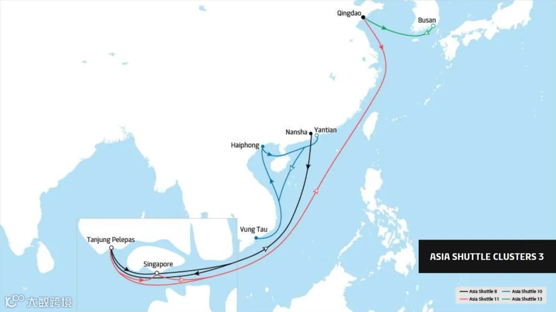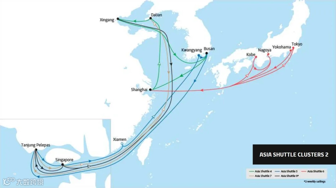 同时,在五大贸易区域布局的穿梭快线分别为:亚洲区域12条、北欧区域6条、地中海区域6条、中东区域4条、北美区域1条。