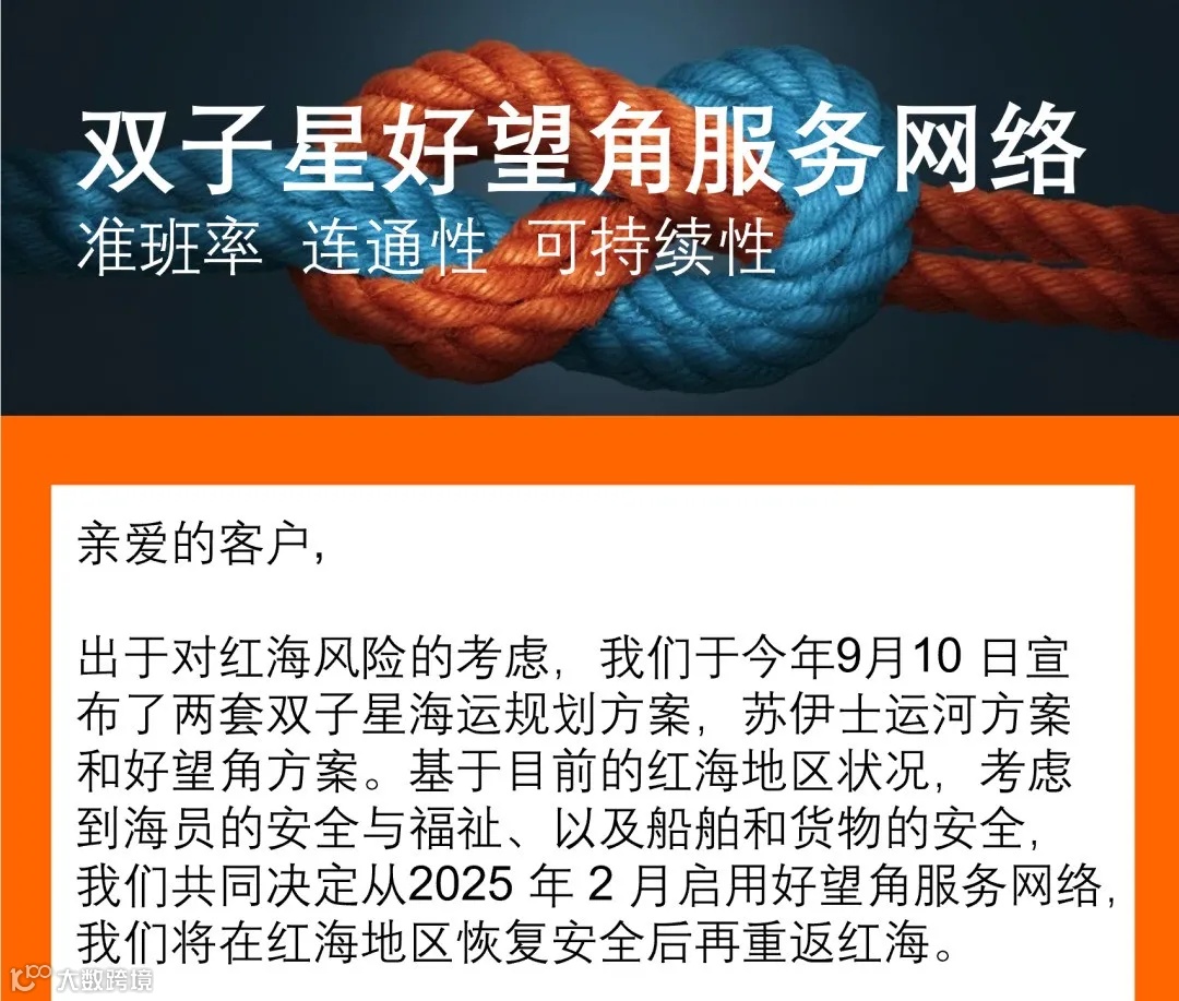 “双子星”合作成员马士基、赫伯罗特决定,从2025年2月起启用好望角服务网络,并将在红海地区恢复安全后,再重返红海市场。