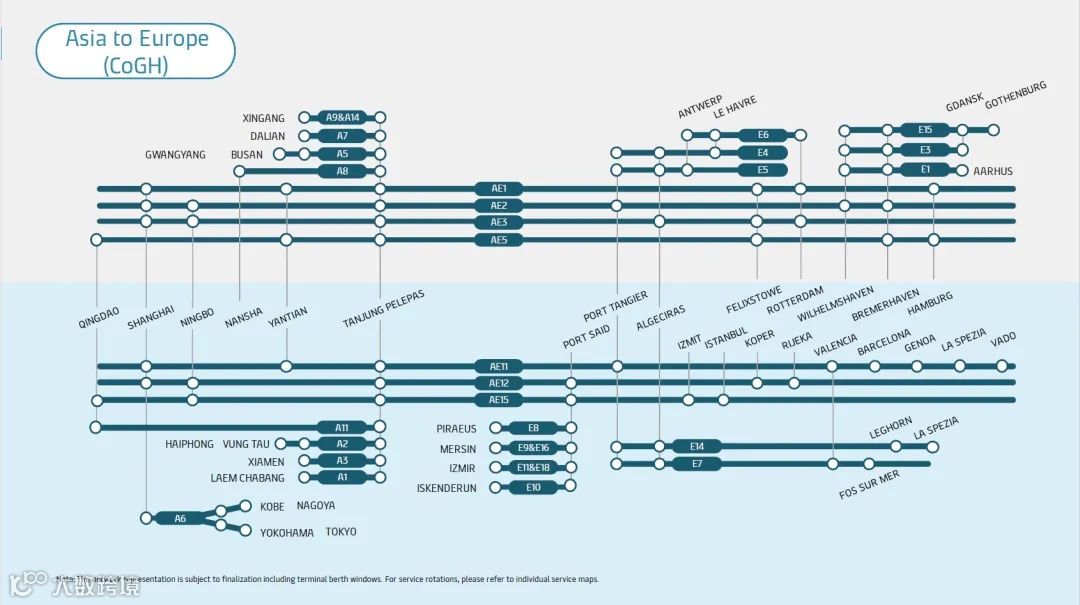 第二,相比于传统的亚欧航线,“双子星”合作每条航线的船舶靠泊次数,平均减少约一半,这将大大提高准班率。