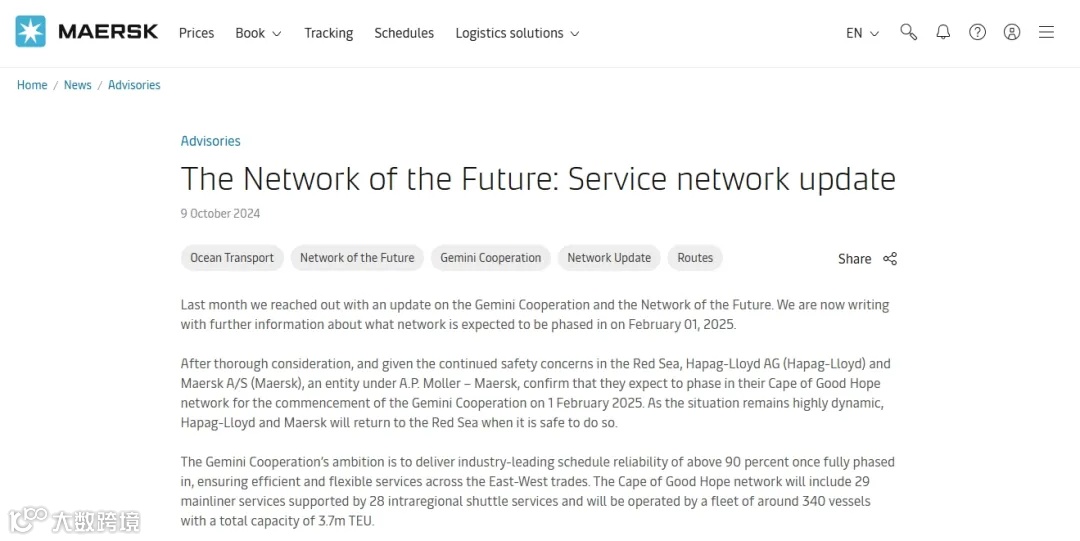 10月9日,由马士基和赫伯罗特组成的“双子星”合作(Gemini Cooperation)发布公告称,基于目前红海地区的状况,考虑到海员的安全与福祉,以及货物和船舶安全,双方确定从2025年2月合作生效起,启用好望角服务网络,并将在红海地区恢复安全后,再重返红海市场。