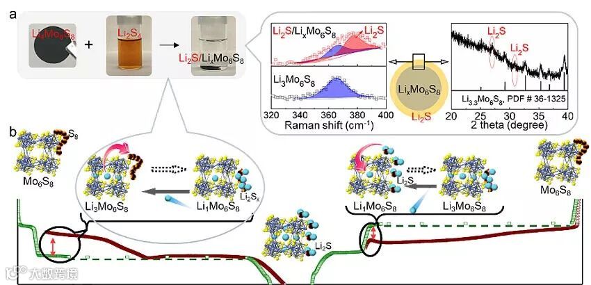 图1. 对“氧化还原-催化效应”这一概念的实验和示意解释。实验可见,将锂化的Li4Mo6S8置于Li2S4溶液中,Li4Mo6S8可自发将Li2S4还原。