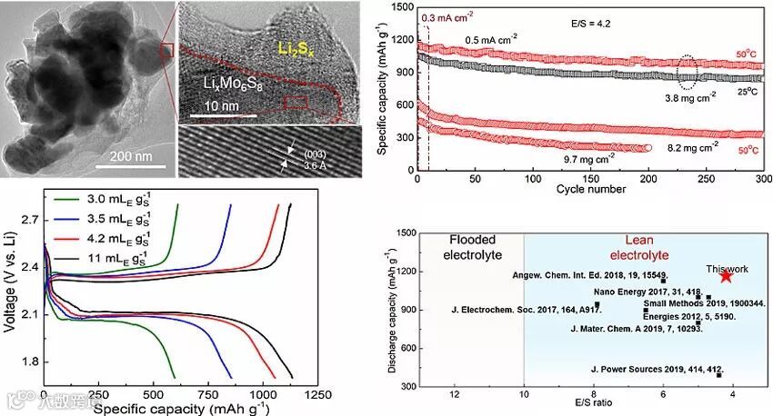 作者提出了一种复合锂硫电池正极结构设计,将Chevrel相Mo6S8和碳负载的S混合构筑复合正极材料,并引入PEO-LiTFSI具有锂离子通道的粘结剂。在贫液(4.2 μL/mg)/高载S(~ 4 mg/cm2)条件下,得到了1155 mAh/g(1.3 Ah/cm3)的高容量,同时实现了较高的循环稳定性(300圈容量保持率约80%)。相比于S材料迟缓的动力学过程,LixMo6S8具有快速的锂离子传输能力、高电子传导性以及对多硫化锂具有高亲和力等优势。同时,在Li-S电池的工作电压区间内,通常1.7~2.8 V vs. Li,Mo6S8具有优异的脱嵌锂离子活性,其三段脱嵌锂离子的主平台电位略高于Li-S的主放电平台。