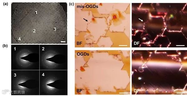 图2. TEM表征及铜电化学腐蚀测试证明石墨烯晶畴很好的定向性及定向晶畴之间的无晶界拼接。图片来源:Mater. Today