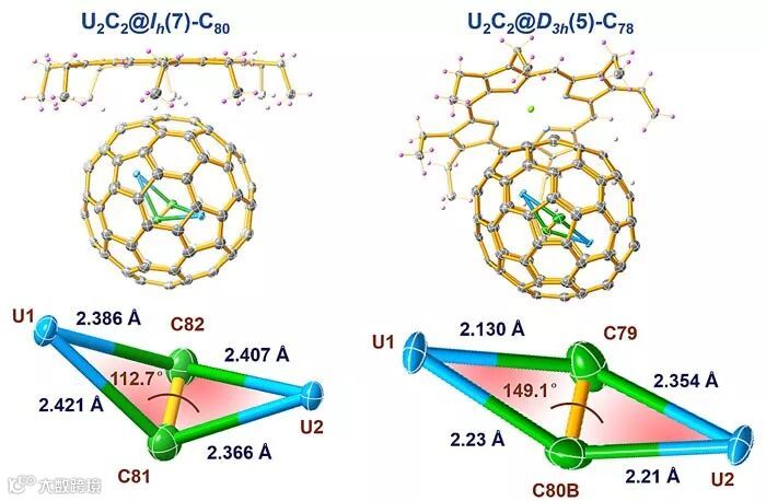 近日,苏州大学的谌宁教授研究团队利用富勒烯作为纳米容器,首次在分子化合物合成得到了由两个C原子桥连的锕系双金属碳化物团簇U2C2,这一团簇被稳定的内嵌于C80与C78富勒烯碳笼中。该研究团队对这两种新型錒系金属团簇富勒烯U2C@Ih(7)-C80 和U2C@Ih(7)-C78进行了X射线单晶衍射、X射线吸收谱、吸收光谱、红外与拉曼光谱、变温核磁共振等多种方式的结构与物化性质的表征,并与纽约州立大学布法罗分校的Jochen Autschbach教授团队合作,进行对其电子结构与价键形态进行了量子化学计算研究。晶体结构研究结果表明,U2C2团簇在富勒烯碳笼中呈现独特的“蝴蝶状”构型,但其具体构型在两种碳笼的影响下有明显差异。在C80碳笼中,U2C2团簇的二面角为112°,而在C78碳笼中,其二面角增加到149°。实验和理论计算研究进一步表明,U2C2团簇的“蝴蝶状”构型是由碳笼的约束作用引起的,如果脱离了碳笼的限制,U2C2团簇趋向于完全的平面构型。这与该课题组此前报道的U2C@Ih(7)-C80中U=C=U团簇由于U=C双键引起的弯曲结构有显著不同,显示出这两种新型的U金属团簇的价键结构与U的价态都存在较大差异。进一步的实验与理论计算研究证实,在U2C2团簇中,内嵌的金属U呈现+4价,且U-C之间的相互作用主要是离子性的。而在U2C团簇中,U呈现+5价,U=C之间具有明显的共价相互作用。