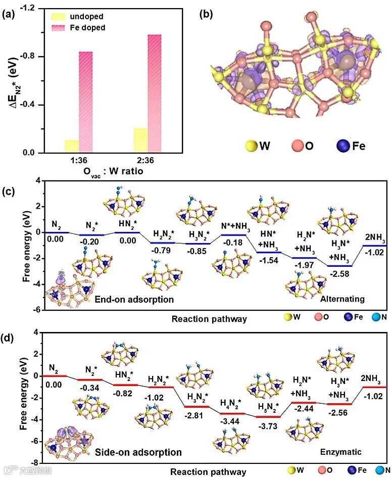 Figure 2. (a) N2 adsorption energy (ΔEN2*) as a function of Ovac : W ratio for W18O49 with and without Fe doping by DFT calculations. (b) The differential charge density between Fe and W18O49 with Ovac : W ratio of 2 : 36 without N2 chemisorption. Purple and orange colors represent electron accumulation and depletion regions, respectively, with isosurface value of 5×10−3 eÅ−3. (c, d) Free energy diagrams of NRR on Fe-doped W18O49 with Ovac : W ratio of 1 : 36 and 2 : 36, respectively. The structures of reaction intermediates are shown next to their energy segments. Left bottom of (c, d) inserted the differential charge density distributions of N2 chemisorbed on Fe-doped W18O49 with Ovac : W ratio of 1 : 36 and 2 : 36, respectively. The Fe/W ratio is fixed at 11%.