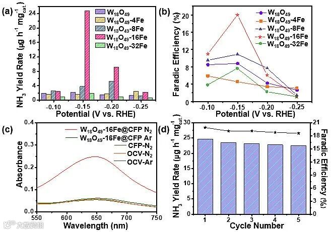 Figure 1. (a) NH3 yield rate at various potentials vs. RHE. (b) Faradic efficiency of as-prepared Fe-doped W18O49 nanowires @ CFP electrodes. (c) UV-vis absorption spectra of various electrolytes stained with salicylic acid indicator. OCV stands for open-circuit voltage. (d) cycling stability results at −0.15 V (vs. RHE) of W18O49-16Fe nanowires @ CFP electrode.