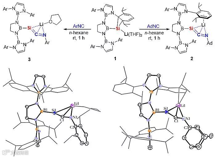 联烯类化合物(X=Y=Z),如联烯(R2C=C=CR2)与烯酮亚胺 (R2C=C=NR)是一类重要的有机化合物,是重要的有机合成子。而其硅类似物硅代烯酮亚胺的合成及结构特性却亟待研究。从结构分析,硅代烯酮亚胺的结构可用两种共振结构来描述,即联烯(R2Si=C=NR)和两性离子结构(R2Si-–C≡N+R)。南开大学崔春明课题组一直致力于新型有机硅烯与含硅多重键化合物的合成与性质研究。该团队设计了具有很大空间位阻效应的硼配体,通过一系列转化合成了有机硅负离子1。该负离子有可能是通过硼取代的硅烯负离子(B-Si-Li)与配体上的苯环进行环化反应所形成。因此,硅负离子1可以看作是硼基硅烯负离子(B-Si-Li )的前体(Inorg. Chem., 2019, 58, 12007)。该团队研究了硅负离子1与一当量金刚烷异腈(AdNC, Ad = C10H15)或芳基异腈(ArNC, Ar = 2,6-iPr2C6H3)的反应,发现可以几乎定量地得到硅代烯酮亚胺负离子化合物2、3,如图1所示。晶体结构分析表明,该化合物中Si=C键长分别为1.725(4) 与1.730(2) Å,处于硅碳双键键长范围内(1.702–1.775 Å),且显著短于已报道的硅代烯酮亚胺化合物(1.782–1.830 Å);其C=N键长分别为1.285(4)与1.279(3) Å,明显长于已报道的硅代烯酮亚胺化合物(1.179–1.210 Å)。较短的Si=C双键及较长的C=N双键表明硅代烯酮亚胺负离子化合物2、3具有显著的联烯特性。