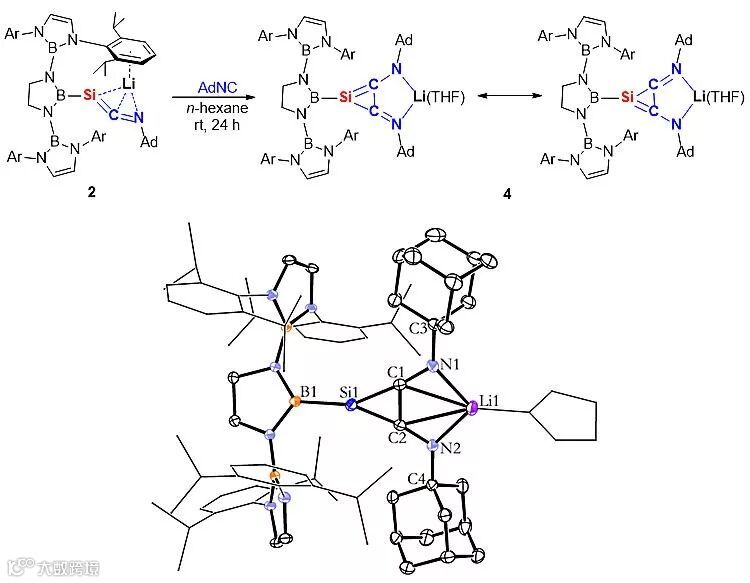 作者还研究了2与另一当量金刚烷异腈的反应,发现可以发生[2+2]环加成,几乎定量转化为具有