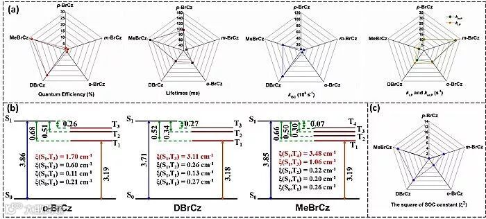 图2:(a)材料的光物理参数;(b)SOC常数和能级示意图;(c)SOC的平方