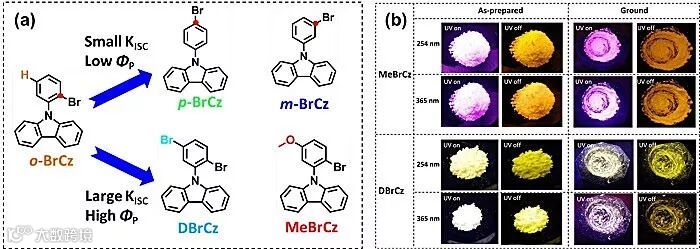 图1:(a)分子结构;(b)研磨前后DBrCz和MeBrCz发光照片