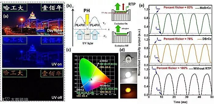 作为概念性验证实验,DBrCz和MeBrCz成功应用于AC-LED,实现了CIE (0.28, 0.29)和CRI大于90的白色LED。此外,他们还证明了RTP长寿命的磷光可以补偿暗光持续时间的影响,其频闪率降低到了78%,为RTP材料在照明领域的应用提供了新的可能性。
