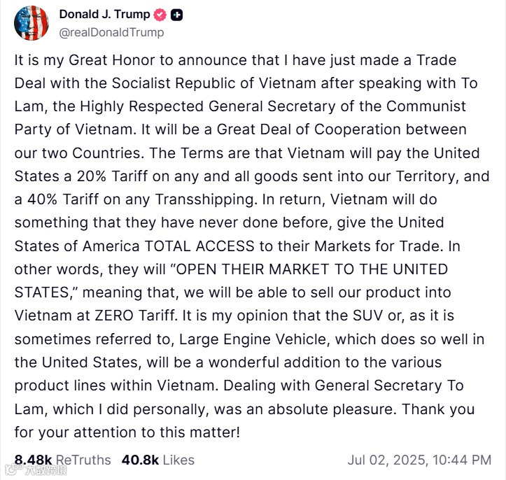 美国东部时间 7 月 2 日晚间,美国总统特朗普在其创办的社交媒体 Truth Social 上宣布,已与越南达成贸易协议。