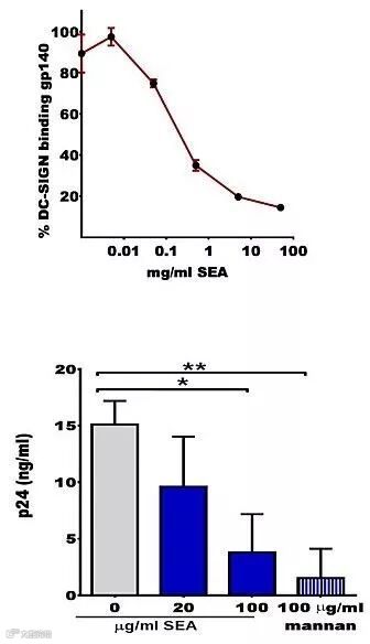 SEA抑制DC-SIGN与HIV-1结合(上);上清液中p24含量说明SEA抑制DC-CD4+ T淋巴细胞共培养体系中HIV-1水平(下)。图片来源:PLoS Pathog.